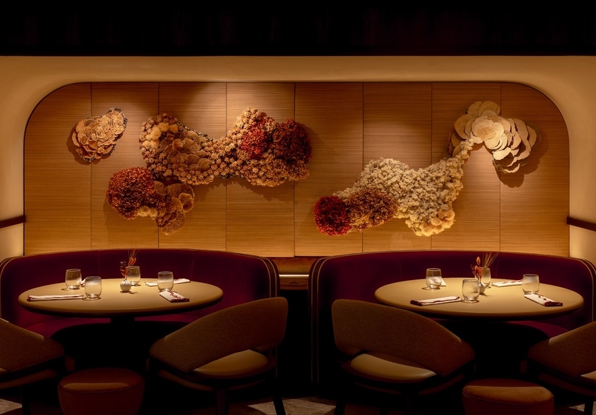 The palette mimics the Australian landscape, with sandstone and clay tones, and floral creations designed to resemble lichens, mosses and wild mushrooms. The calm, coastal brightness softens the basement’s former formality. Curved lines and plush upholstery – including carmine-red velvet banquettes – round out a room that feels both contemporary and deeply personal.