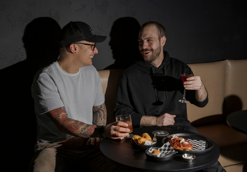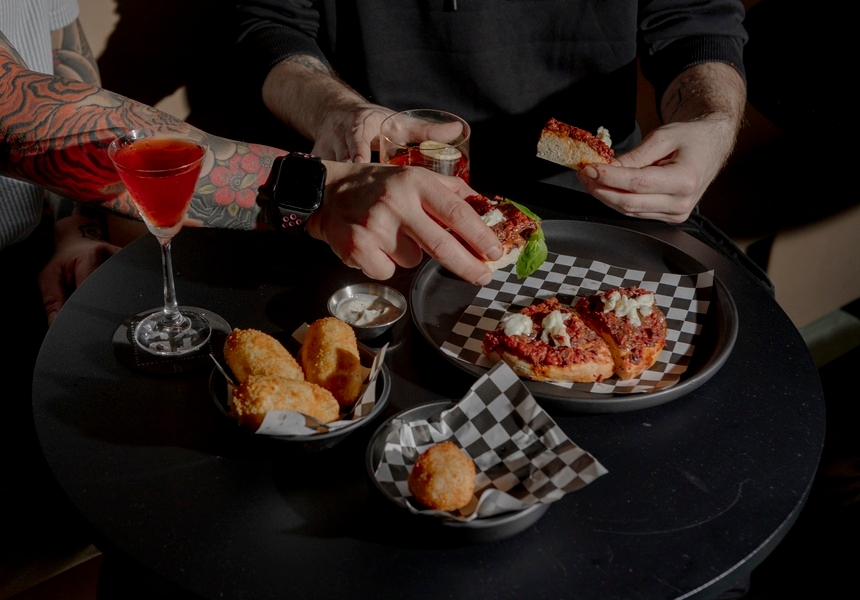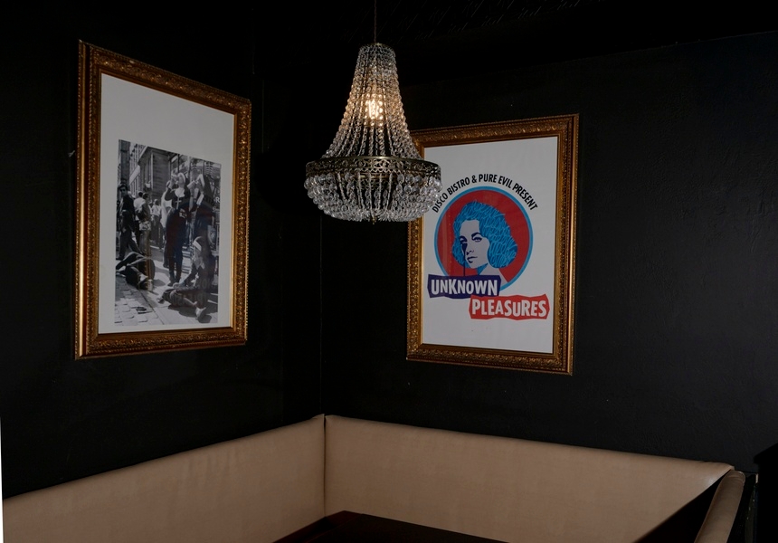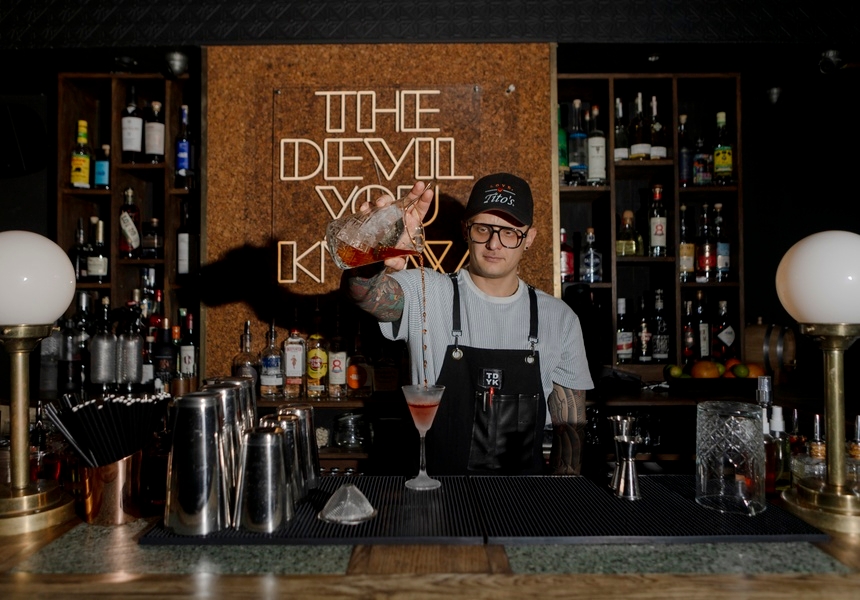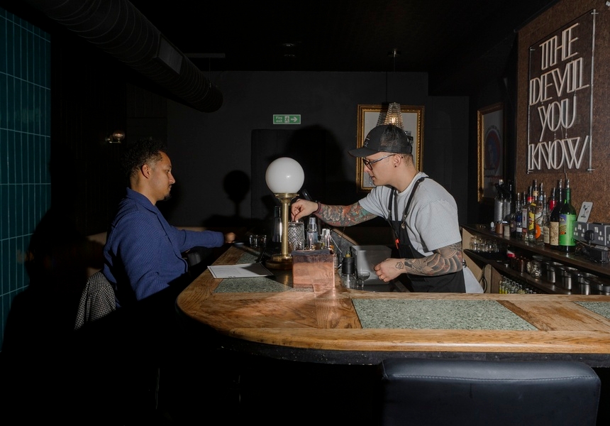 The bar’s warm, modern lighting and sleek banquettes, as well as its teal tones, cosy tables, black walls and chequered floor echo classic Italian design, while punk collages and blue neon lighting are designed to kick typical speakeasy conventions to the curb. “Lidia did all of the design,” says Simone. “We wanted it to feel dark and intimate. It’s the devil you know, right? So it had to suit the name but also feel warm and intimate when you come with your friends.”
