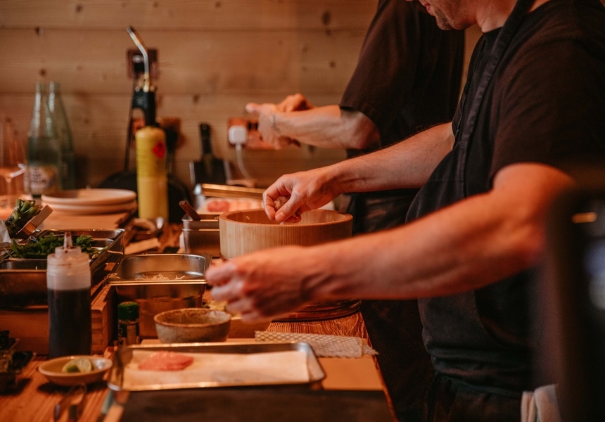 Head chef Jiaxiong “Nicky Noodle” Xie and his team theatrically prepare the sushi on a slightly raised plinth behind the counter, giving diners a direct eyeline to their work. But behind the scenes is where much of the effort takes place.
