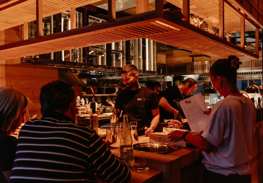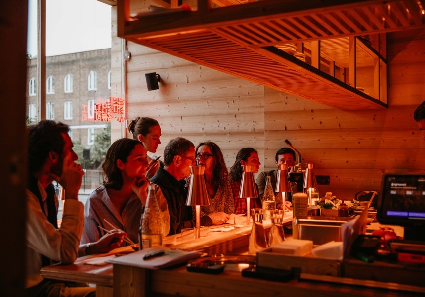 In a space resembling what D’Sylva calls a “sushi sauna”, chefs mould nigiri and delicately slice sashimi to order for eager crowds waiting for a table at the walk-in-only eatery. The wood-lined room mixes the idea of a log cabin with the philosophy and clean lines of Japanese design. The textural, warm pine was made to spec in Verbier, Switzerland.