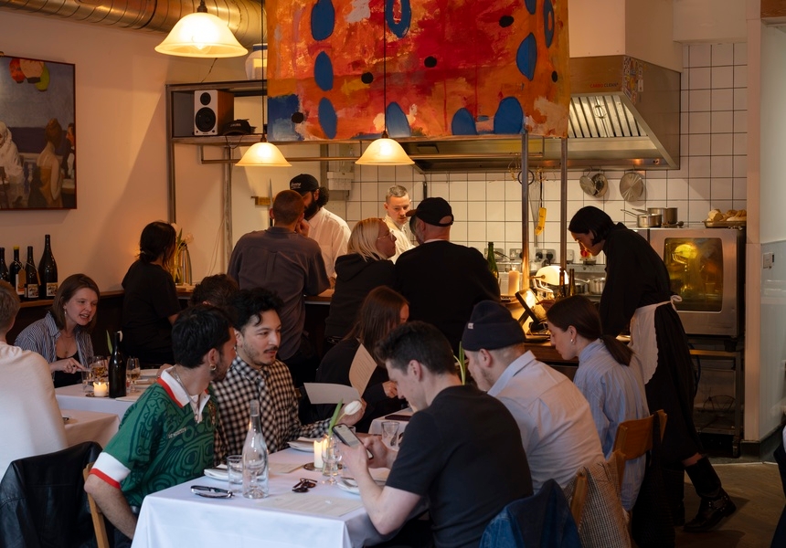 Named for the sad, smoking clown in Edward Hopper’s 1914 painting, Soir Bleu, the restaurant is “all about contrast and emotion,” co-founder and general manager, Dylan Walters (ex-Bambi), tells Broadsheet. “It’s about having fun. You’re eating meat off sticks, getting a bit messy, and then there’s a white tablecloth underneath it. It plays into the whole concept. It’s theatre.”