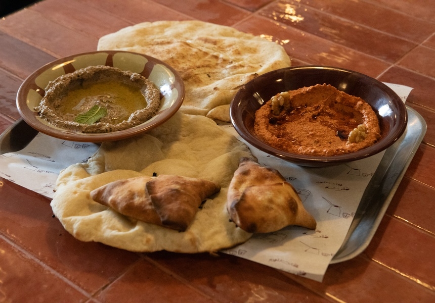 There are also smaller bites, including triangular pastries filled with spinach named fatayer, alongside a selection of dips including black chickpea hummus and muhammara, a red pepper and walnut paste.