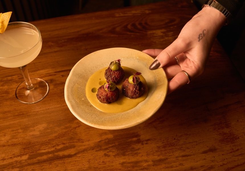 The space itself is styled with undulating curves and moody lighting. Striking arches separate rooms decorated with sculptural mirrors and blue banquettes. As for the name? It commemorates the date Mortley’s grandmother passed away: October 22, 2021. He has the same numbers tattooed on his fingers.