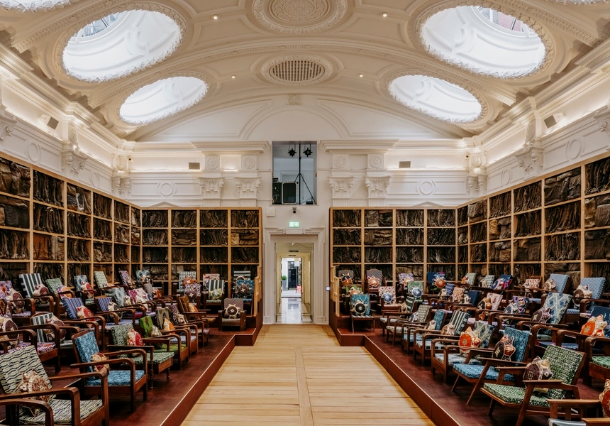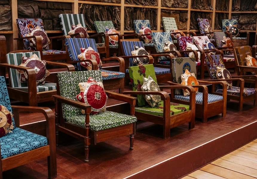 Up ahead is the Majlis (an assembly space), now home to Ghanaian artist Ibrahim Mahama’s Parliament of Ghosts installation. Using repurposed colonial-era furniture arranged on tiered platforms, the installation forms a phantom parliamentary chamber built from the remnants of Ghana’s colonial and post-independence infrastructures, including timber salvaged from the country’s colonial-era railway. Visitors can settle into the mismatched chairs beneath the cornice-lined skylights that flood the room with daylight; it’s both an exhibition and a gathering space.