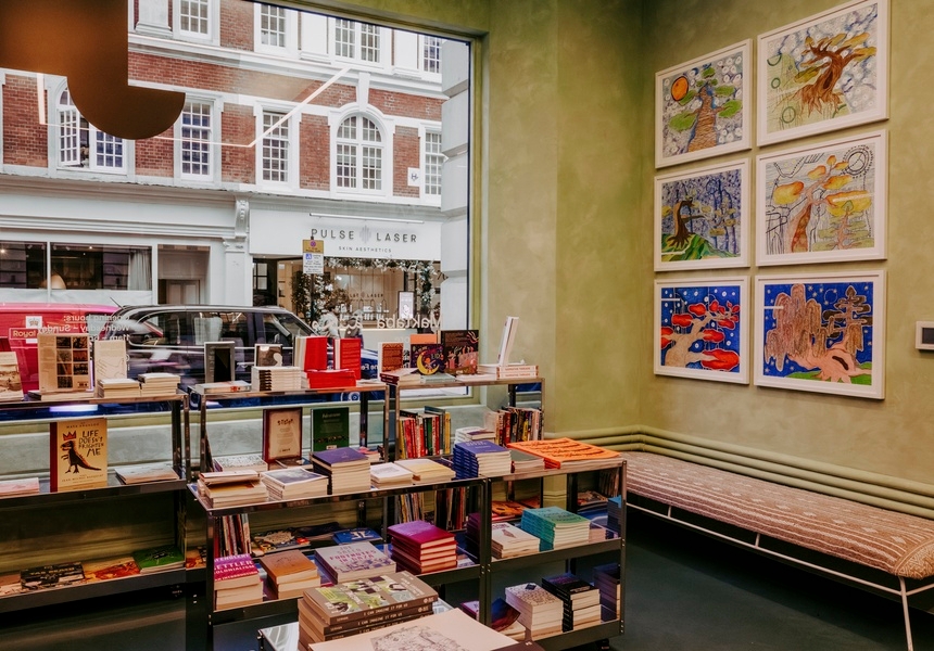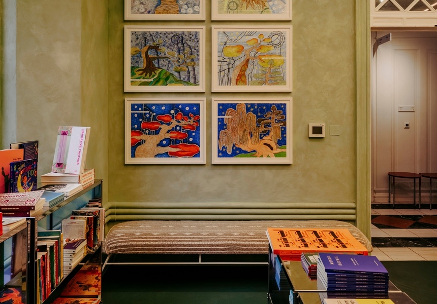 Step inside and the building branches out in three distinct directions. To the right is the pale green bookshop-in-residence curated by the Palestine Festival of Literature and Burley Fisher Books. Called the Maktaba, its shelves are stacked with titles spanning the Arab and Muslim worlds and their diasporas. To the left, the dusty pink Tunisian cafe Oula serves coffee, pastries and keskrout tunisien, a Tunis street-side sandwich layered with wild capers and fermented vegetables, and smothered in harissa.