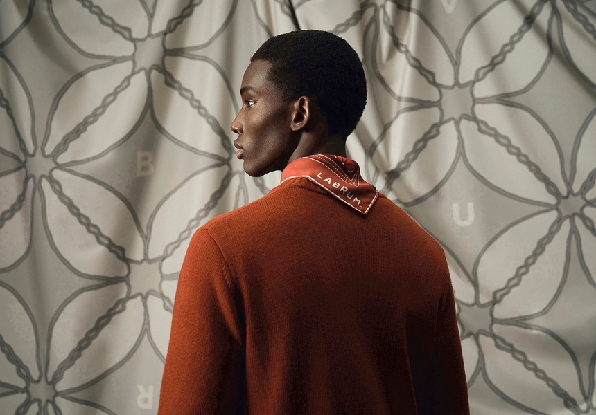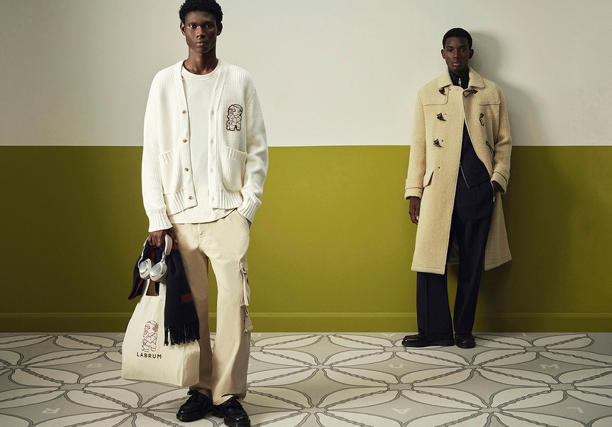 The collection includes textured cotton shirts with Labrum London’s geometric monogram logo, cardigans and canvas overshirts embroidered with the nomoli symbol, and baseball caps also emblazoned with the logo.
