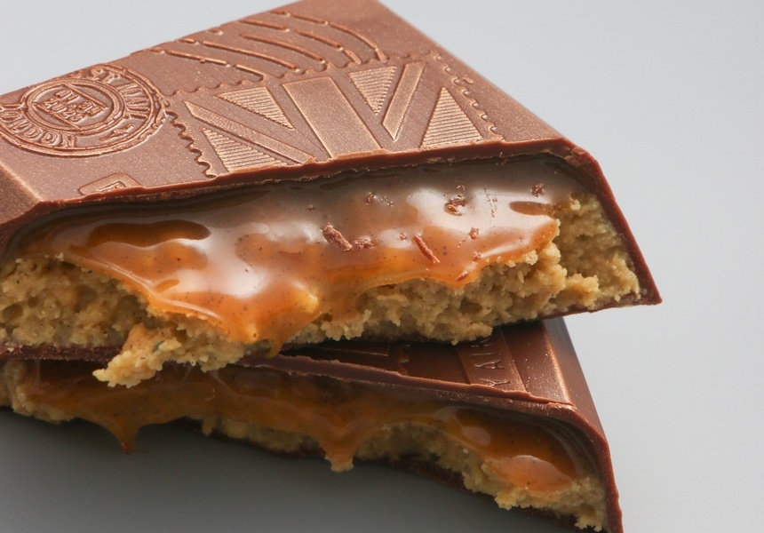That caramel is layered with a vanilla biscuit crunch Khoury says is a cross between a shortbread and a Rich Tea biscuit, and is encased in 50 per cent almond-milk chocolate. It’s also, incidentally, plant-based. Khoury has gone to great lengths to select ingredients that are ethical and sustainable, including chocolate from a brand that regenerates rainforests.