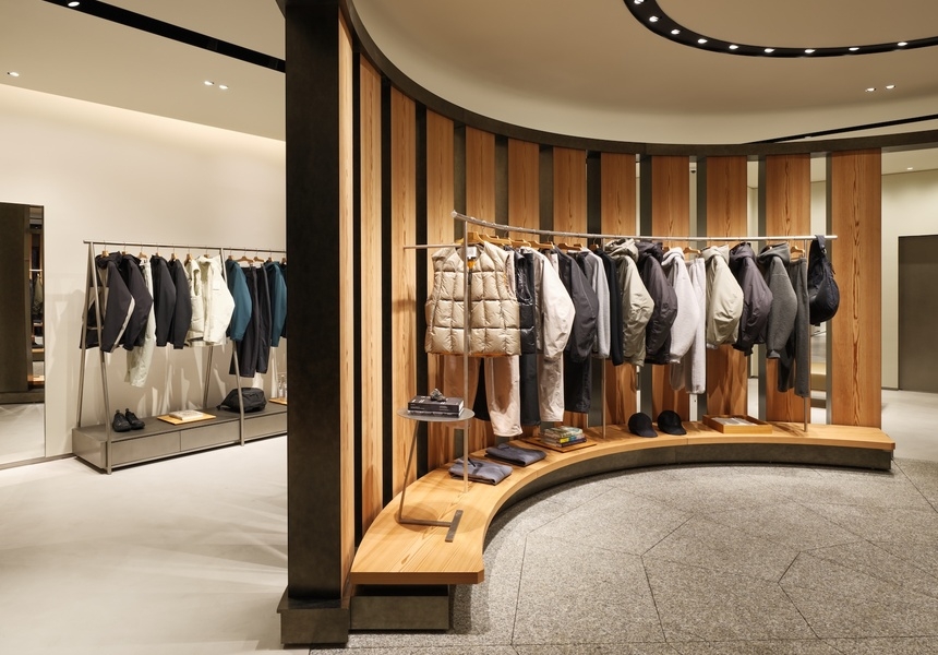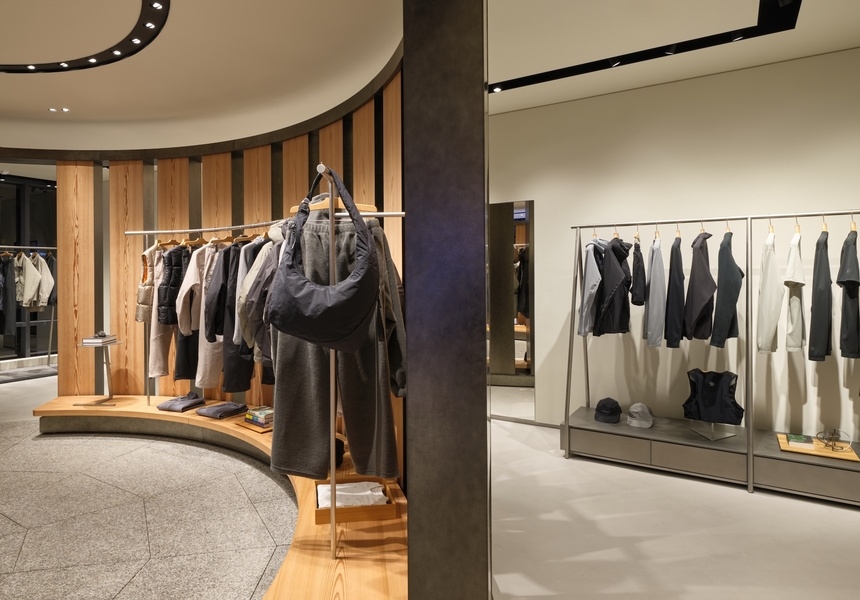 In the spot where a vegetarian Pret used to stand, there’s now a circular shopfloor dominated by columns mimicking a Japanese yashiro, or shrine. In its centre an inner circle of Akita Sugi cedar timber posts, echoing traditional Japanese architecture. By contrast, its outer rim consists of 12 vertical LED screens displaying nature videos and abstract video art. This theatrical area – designed by Japanese architecture firm New Material Research Laboratory, showcases Goldwin’s classic and basic clothing lines, including Goldwin 0. This experimental line was launched in 2022 and is a testing ground for innovative fabrics and processes, such as lab-grown yarns and waterproof textiles made from waste plastic. Goldwin 0’s design director is Nur Abbas who has worked at Louis Vuitton, Maison Margiela and Uniqlo.