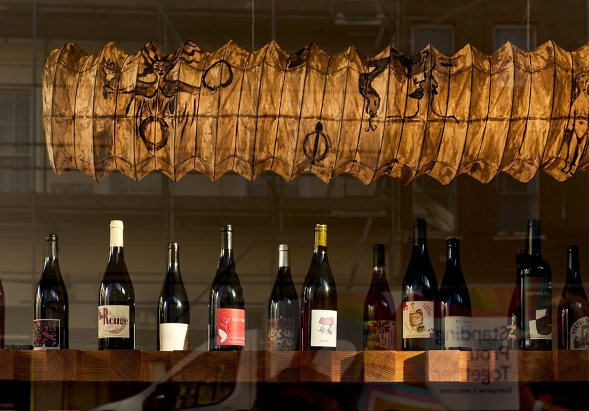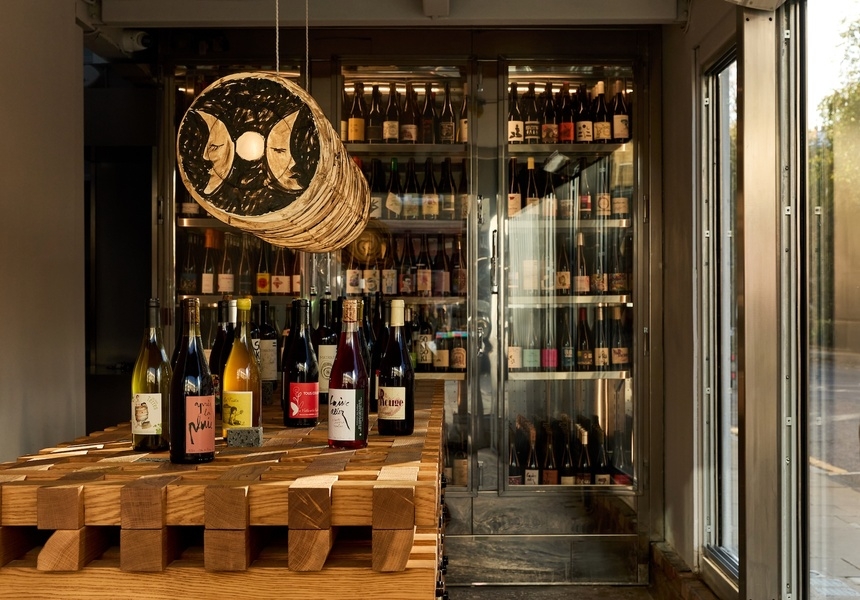Up top, that glass-wrapped street-level space functions as a wine shop, with an ever-changing edit of bottles displayed across the counter and shelving. The selection is overseen by wine director Nathalie Nelles alongside general manager Fred Clelland, and promises progressive, low-intervention producers, with a particular focus on so-called “zero-zero” wines (bottles made without additives and with minimal interference from vineyard to cellar).