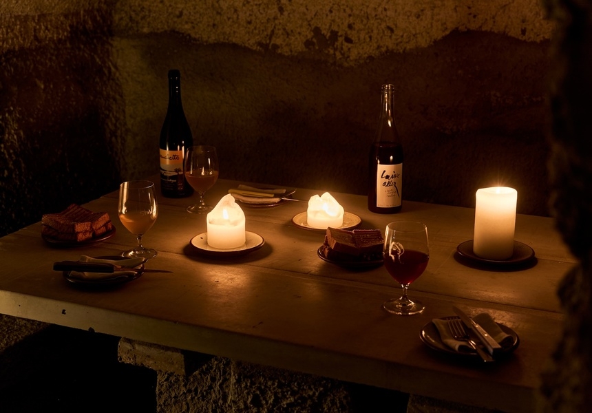 Downstairs, the mood shifts into a different dimension, where the stripped-back cellar’s winding corridors open into hidden corners and vaulted rooms where stone arches frame pockets of seating. Bare, textured walls and a distressed concrete floor are softened by just enough candlelight to make sense of the menu, while custom glassware illustrated with elegant Grecian figureheads is designed to let you know when it's time for a top-up.