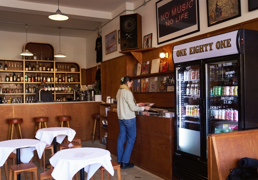 Gilmore’s vision was to create a space where everyone feels welcome, not just crate-digging vinyl disciples. With bespoke wood panelling that matches the venue’s retro frontage, One Eighty One feels like a mid-century living room – one with vinyl racks on the side of the room and a bar at the back. Gilmore and his team serve coffee, craft beer and cocktails (the latter priced at £10 each) while also dishing up cheese and charcuterie boards, and “crisp platters” with toppings like cheese and cured meat. He points out proudly that One Eighty One’s bread and cheese are sourced from independent stores “a few doors down from us”.