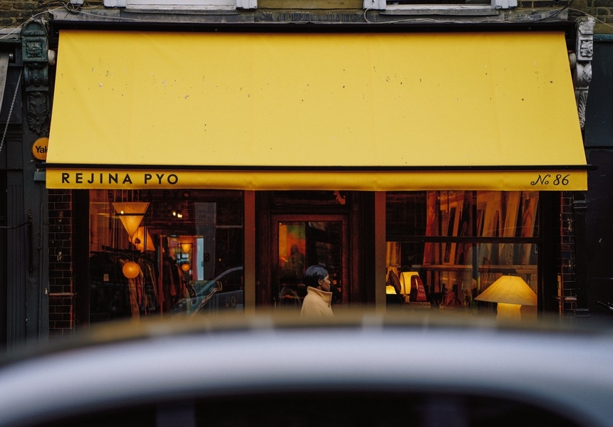 Set within a heritage building on Golborne Road, Rejina Pyo 86 is a multi-faceted space that the designer describes as “part atelier, part gallery, part living room”, inviting customers to engage with the art, garments, and design features that Pyo has curated. Beyond the yellow awning and red brick shopfront lies a treasure trove that is equal parts an homage to the building’s former life as a 19th-century grocery store as it is a peek into the mind of its new resident. Seventies lamps cast a soft glow on the Carrara marble counter stretching across the room, which displays an array of shoes, jewellery, and objets d’art; Pyo’s signature knot-handled bags stand like museum pieces on low glass tables; and the voluminous sleeves of her garments peep out from the clothing rail that runs along the wall.