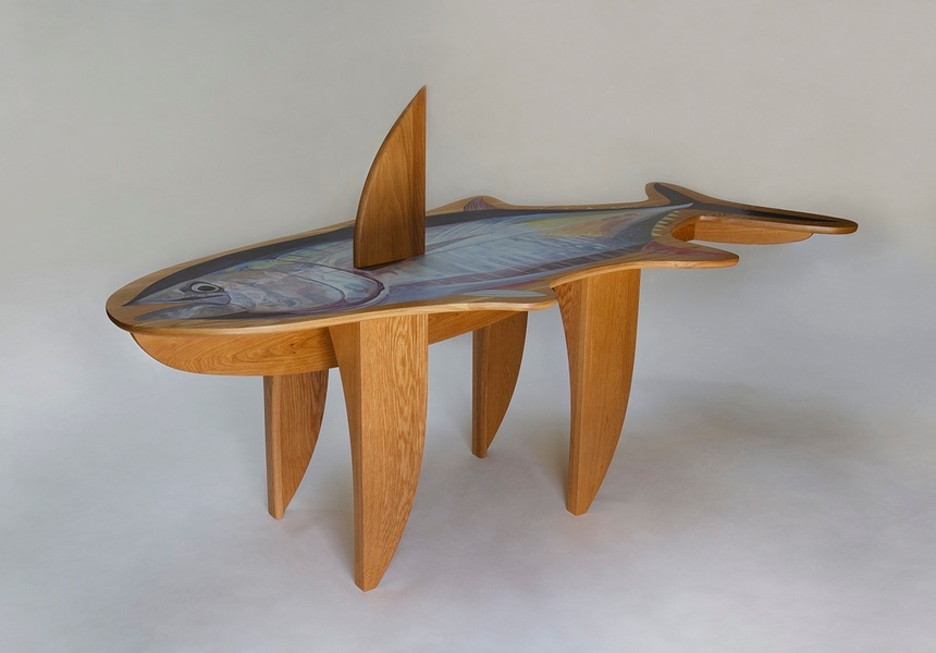 As much as Kobayashi’s approach is grounded in craft, it is also livened with his sense of humour. His 2023 solo show Manus Manum Lavit (“one hand washes the other”) at Cromwell Place was a case in point. Among the highlights was Fatty Tuna, a dining table which makes a four-legged fish, its dorsal fin doubling as a serving board. Piece of Cake, a modular sofa made with designer Flavia Brändle, upholstered in a Peter Pilotto x Christopher de Vos textile was on display in a neighbouring room. “We wanted to be convivial by mixing together,” Kobayashi said.