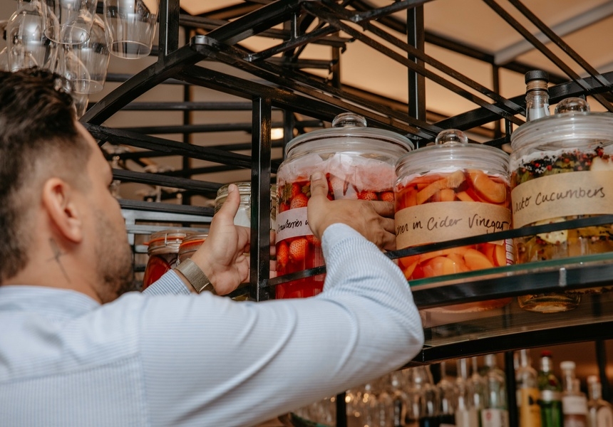 Seasonality is key to the menu. Much of the produce is grown in Wolves Lane, the North London kitchen garden the group has had for five years. Each day Rovi’s chefs receive a Whatsapp to inform them of the most recent spoils, around which they build a menu – or a future menu, thanks to its fermentation program. When Broadsheet visits, Campbell is plotting how to use umeboshi (Japanese plums) that were picked and pickled earlier this year.