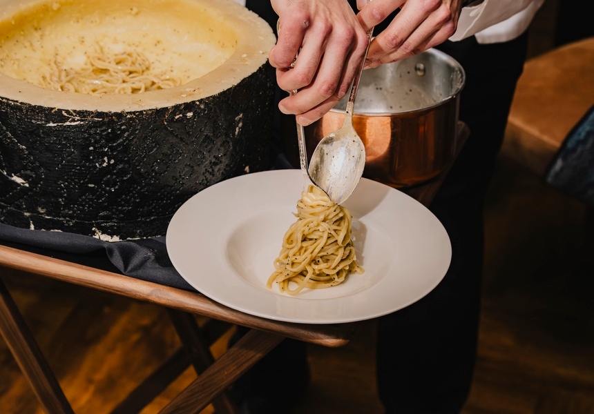 Caesar salad and cacio e pepe – both Sale e Pepe signatures – are mixed tableside while champagne trolleys circulate through the space. Larger-than-life towers of fruits de mer arrive on glistening gold platters, while classics such as delicate lobster linguine and salt-baked whole sea bass sit alongside clams and steaks straight from the Josper grill.
