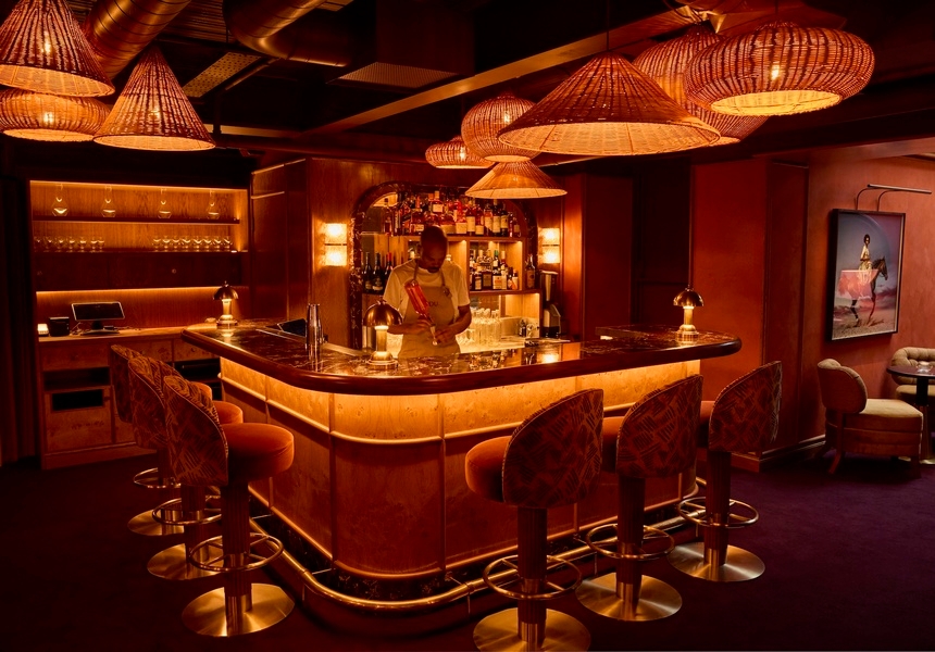 The new bar mirrors the intimacy of the original Smokey Kudu, but with added warmth via red clay walls, velvet upholstery, peach and orange tones, and a glowing statement fireplace. Designed by Fabled Studio (Josephine, Noble Rot Mayfair), the room blends marble details with a berry-hued carpet, works by artists including Zimbabwean fine art photographer Tamary Kudita, and a private dining room for up to 12 guests “It’s very sexy and feels tucked away, despite being above the restaurant,” Corbin says.