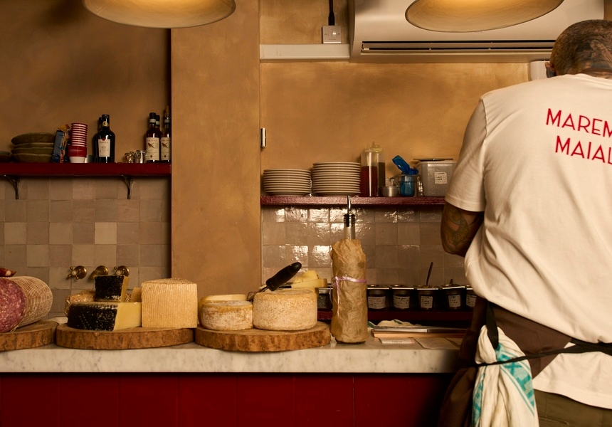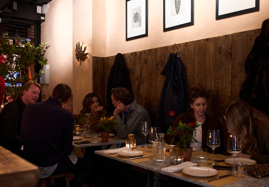 The space, which is spread across two floors, as well as a small courtyard, was designed entirely by the couple. “We didn’t use an interior designer; we did it all ourselves, inspired by our favourite places in Italy,” Boglione says. White marble butcher’s tables sit beside communal wooden benches, with hand-blown crystal glasses, brown butcher paper placemats and even a few lemon trees from the Petersham Nurseries’ greenhouse.