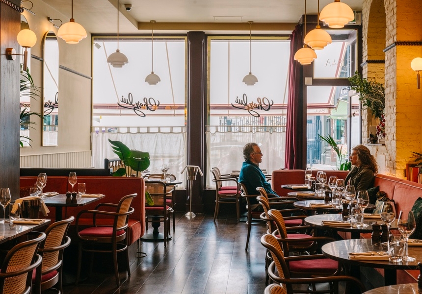 Chez Lui’s exterior has all the classic French trimmings: a burgundy facade, an awning, half-drawn curtains at the windows, and a cluster of tables and chairs for al fresco dining. Inside, the fit-out by Dior Maison collaborator Sam Baron transports diners into a recognisably Parisian bohemian luxury setting.