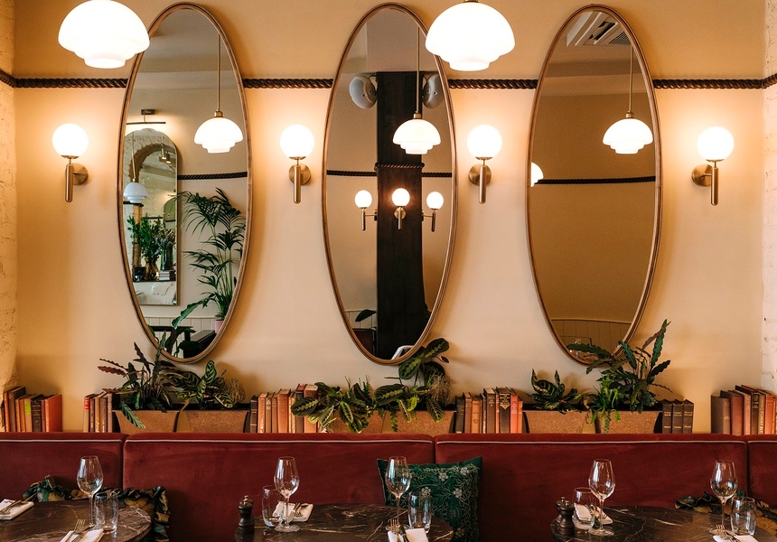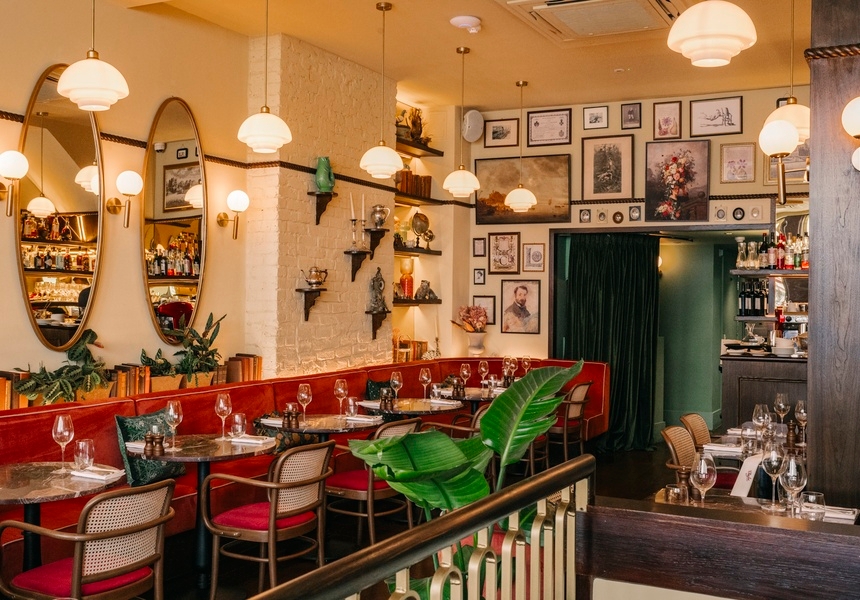 Velvet banquettes line ivory-washed walls, which are hung with a mixture of oil paintings, sepia-toned landscapes and antique botanical prints. Lush green plants dot the space and vintage shelves overflow with objets d’art: candlesticks, ceramic vases and collectors’ books. A jewel-toned cocktail bar with low lighting and cushy banquettes will open downstairs in September.