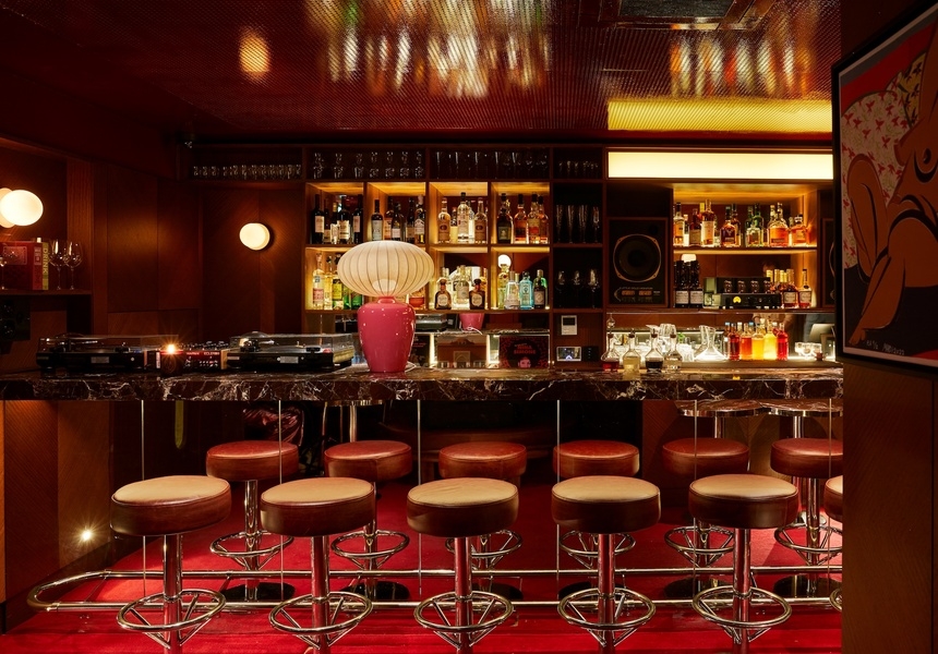 All deep reds and dark woods, with room for just 20 to 25 people split across high leather bar stools and corner nooks, Encore might feel like a living room but it’s an impressively high spec one. Designed for optimum sound quality, the acoustic ceiling and wall panelling bring to mind an after-hours bar in a ’70s recording studio; Farah also acquired refurbished Little Gold Monitor Tannoy speakers “to deliver a raw, authentic listening experience, perfect for vinyl”.