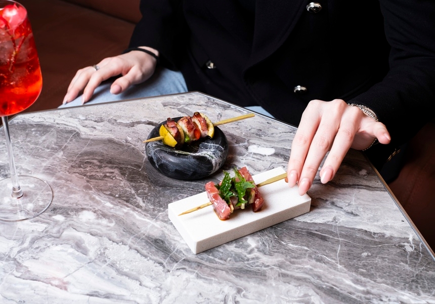 There’s a substantial food menu, too. Small plates and desserts mix Asian ingredients with Eastern European flavours and European bar food traditions. “We don’t want to focus on one category,” Kostenyuk says. “We’re about collecting the most exciting ingredients across the world.” Among the opening dishes are bluefin tuna and octopus skewers, loosely inspired by gildas, as well as a luxuriously silky (and very a la mode) matcha trifle.