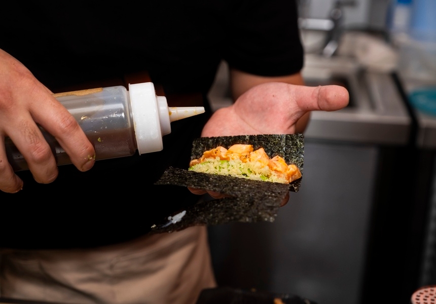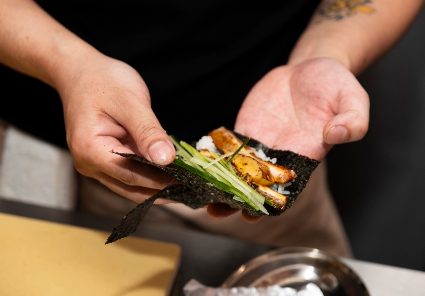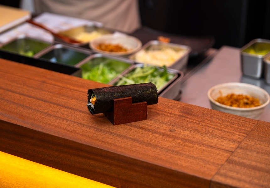 The specialty – otherwise known as temaki, which means "hand-rolled" in Japanese – is made up of sushi rice and ingredients such as fish and vegetables wrapped in a crisp sheet of nori by hand, then passed straight to the palm of the diner who ordered it. “It’s like an omakase experience,” says head chef and Tobi Masa alumnus John Randy De Guzman. “Everything is made fresh in front of you and designed to [be] eaten immediately. Once the chef has made it, you need to eat it right away.”