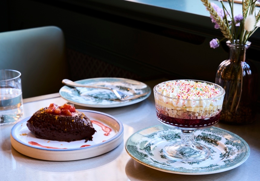 Diners can settle into a booth and admire the bright dining room’s antique mirrors and original herringbone flooring. Or, they could take a pew at the eight-seater “pudding counter” to watch the pastry chefs whip up jam roly poly, silken rice pudding and “Granny Campbell’s Trifle” – a dish particularly close to Turner’s heart. “When I was a kid, every Sunday my granny would cook us a really nice Sunday roast. While she was making it, she’d be knocking back the sherry and whatever was left would go in the trifle. We wanted to replicate that. We had a lot of fun with it.”