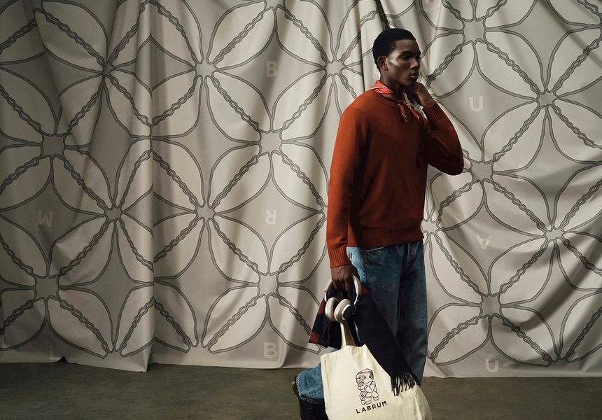 The collection includes textured cotton shirts with Labrum London’s geometric monogram logo, cardigans and canvas overshirts embroidered with the nomoli symbol, and baseball caps also emblazoned with the logo.