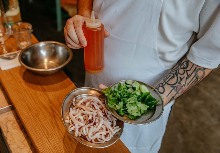 London Shell Co chef Fede Pollame first makes a Sichuan oil with Sichuan peppercorns, cumin seeds, garlic, ginger, fresh chilli and seasoning. He prepares the squid and cuts the body into strips resembling udon noodles, and the wings into small triangles. It is heated in the oven for mere minutes until just cooked through, so it will take on the flavour of the oil and peppercorns while releasing its own moisture to add flavour to the oil. The squid is then drenched in the oil, topped with chopped cucumber, fresh coriander – including stalks for flavour – and a touch of red wine vinegar and salt.