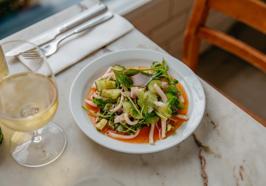 The inspiration for the Sichuan squid came from a love of spicy Chinese food, like the mouth-numbing hot pot or dry-fried chicken eaten frequently at after-service trips to a local Chinese restaurant for, or the cold crunchy beef tripe in spicy oil at Dumplings’ Legend in Chinatown.