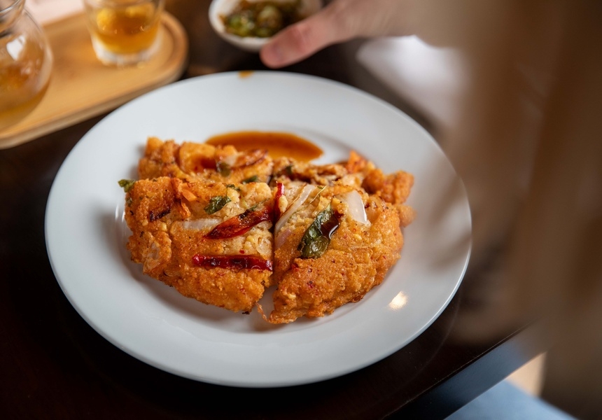This pancake is like nothing I’ve eaten before. Made from mung beans instead of flour, the batter isn’t smooth – the texture is complex, alive. It arrives golden, gorgeous, confident. Fully aware it’s the best thing on the table and understanding of the fact that you are not emotionally prepared for what’s about to happen inside your mouth. The edges are fried to a crisp so glorious I squeaked. Inside it’s warm and squashy and tart. A pancake with layers, personality and, crucially, no grease. No sog. No weird aftertaste. Just 10/10 flavour with an ASMR crunch.