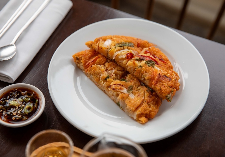 I pictured the stuff I ate growing up, and imagined the pancake would arrive globby and heinous – something I’d soak in soy and immediately forget about. It wouldn’t matter anyway; I was fired up for the beef tartare and ox-bone broth, the dishes everyone was already banging on about.