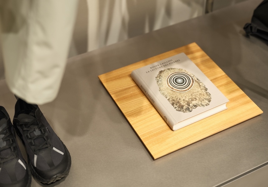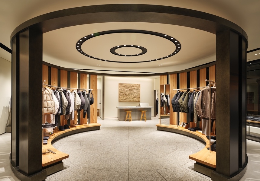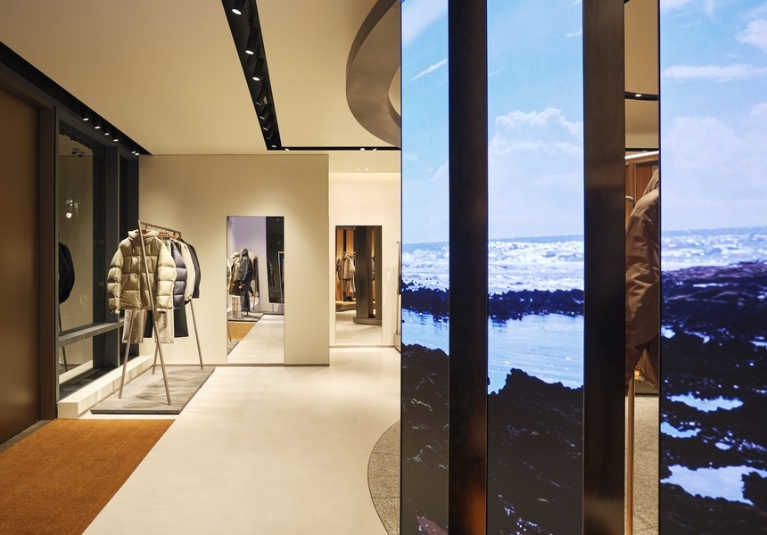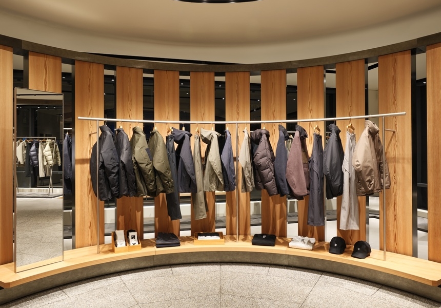 In the spot where a vegetarian Pret used to stand, there’s now a circular shopfloor dominated by columns mimicking a Japanese yashiro, or shrine. In its centre an inner circle of Akita Sugi cedar timber posts, echoing traditional Japanese architecture. By contrast, its outer rim consists of 12 vertical LED screens displaying nature videos and abstract video art. This theatrical area – designed by Japanese architecture firm New Material Research Laboratory, showcases Goldwin’s classic and basic clothing lines, including Goldwin 0. This experimental line was launched in 2022 and is a testing ground for innovative fabrics and processes, such as lab-grown yarns and waterproof textiles made from waste plastic. Goldwin 0’s design director is Nur Abbas who has worked at Louis Vuitton, Maison Margiela and Uniqlo.