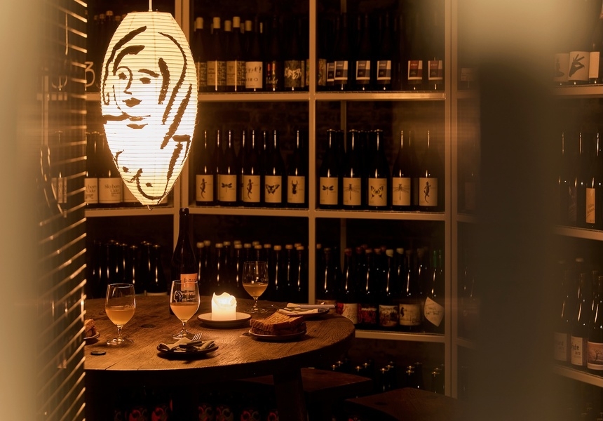 Up top, that glass-wrapped street-level space functions as a wine shop, with an ever-changing edit of bottles displayed across the counter and shelving. The selection is overseen by wine director Nathalie Nelles alongside general manager Fred Clelland, and promises progressive, low-intervention producers, with a particular focus on so-called “zero-zero” wines (bottles made without additives and with minimal interference from vineyard to cellar).