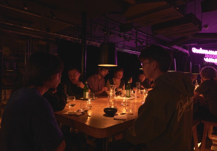 Before dinner service, crates of produce are cleared away and a long display case is topped with planks which jigsaw into a communal table. Even with the nighttime updo, the space retains a casual feel. Every seat in the house is a stool. But details like thick black curtains blocking out Holland Park Avenue and dim candlelight make the setting feel playful, rather than unfinished.
