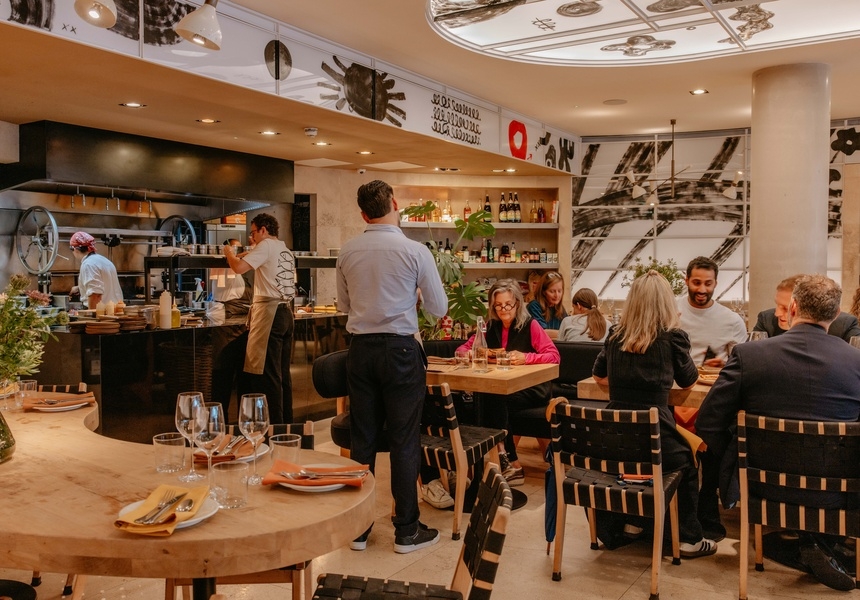 Most noticeably, the lipstick-red banquettes have been reupholstered in sleek black. Artists Gilles and Cecilie have turned the space into a large-scale artwork, daubing the walls and ceiling with charcoal in flowing, abstract shapes with pops of red paint. Similar charcoal smudges decorate the menu and new staff uniforms. The restaurant’s sturdy wooden tables and the curved bar that greets diners as they enter remain.