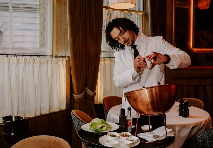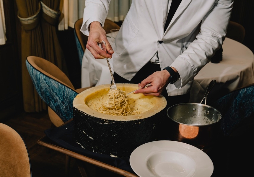 Caesar salad and cacio e pepe – both Sale e Pepe signatures – are mixed tableside while champagne trolleys circulate through the space. Larger-than-life towers of fruits de mer arrive on glistening gold platters, while classics such as delicate lobster linguine and salt-baked whole sea bass sit alongside clams and steaks straight from the Josper grill.