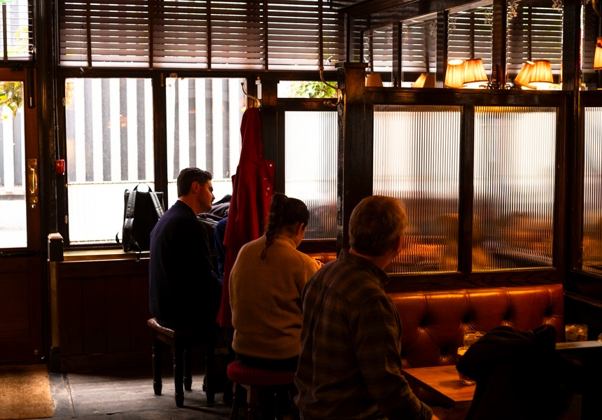 The bijou boozer couldn’t be altered too much, as it’s part of a listed terrace. “It’s quite higgledy-piggledy, but that’s part of the charm to me,” Grossman says. Instead, it’s been lovingly refitted, with a burgundy gloss ceiling, restored original wallpaper, mirrored booths with ribbed glass panels, artworks and trinkets sourced from the Sunbury Antiques Market in Kempton, plus a new hanging pub sign also hand-drawn by Palmer. “It’s Soho – there’s a pub every five metres. But not that many that feel like you’re walking into your local.”