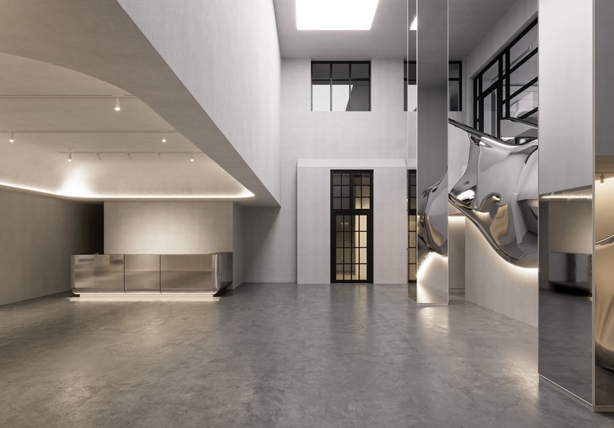 She’s right; it is impressive. First, there’s the Vision Hall, with its soaring 13-metre-high ceiling and vast arched windows. Right now, it is hosting Prada Mode’s centrepiece installation, The Audience, in which a giant screen plays a blurry, looped scene before an audience of eerily lifelike human sculptures. Downstairs, there’s the Inner Space, designed by British interior designer Tom Dixon. “This will be the main exhibition space,” says Damtsa, as she points out Dixon’s curved silver staircase and marble columns. Elsewhere, there’s original dark wood panelling, terrazzo flooring and brass fixtures, melding the building’s heritage with modern touches.