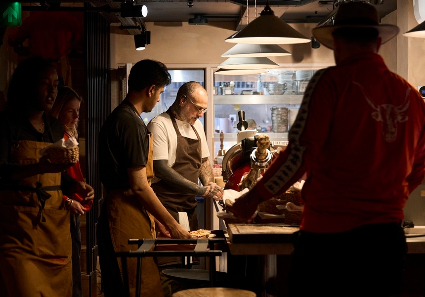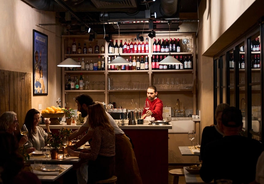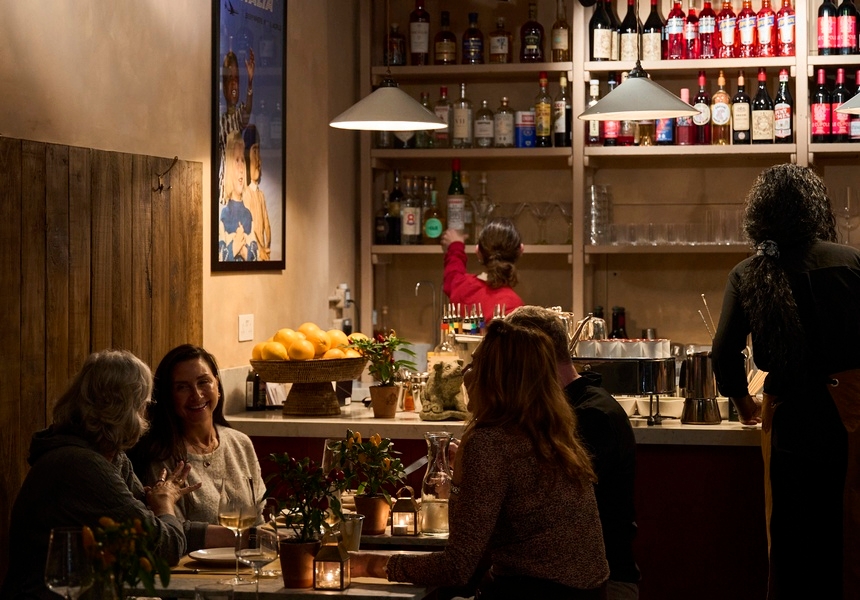The space, which is spread across two floors, as well as a small courtyard, was designed entirely by the couple. “We didn’t use an interior designer; we did it all ourselves, inspired by our favourite places in Italy,” Boglione says. White marble butcher’s tables sit beside communal wooden benches, with hand-blown crystal glasses, brown butcher paper placemats and even a few lemon trees from the Petersham Nurseries’ greenhouse.